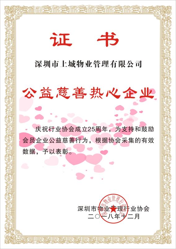 在慶祝深圳市物業(yè)管理行業(yè)協(xié)會(huì)成立25周年之際,上城物業(yè)被授予公益慈善熱心企業(yè)稱號(hào),以表彰公司在公益慈善事業(yè)中做出的無私奉獻(xiàn)。